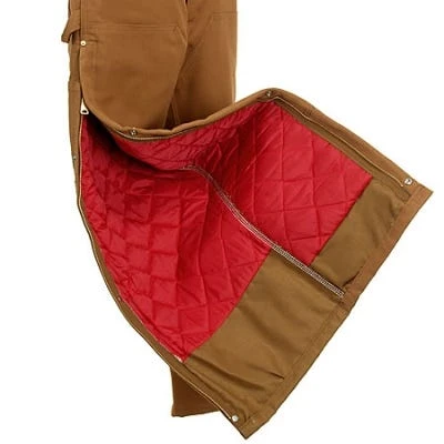 These Carhartt overalls provide inner lining that is made with 100% abrasion-resisting nylon, lightweight and airy. Quilted to mid-weight polyester, the soft lining provides padding for extra comfort. These Carhartt overalls zip all the way to the hip for easy removal, with a zipper fly for easy body maintenance.