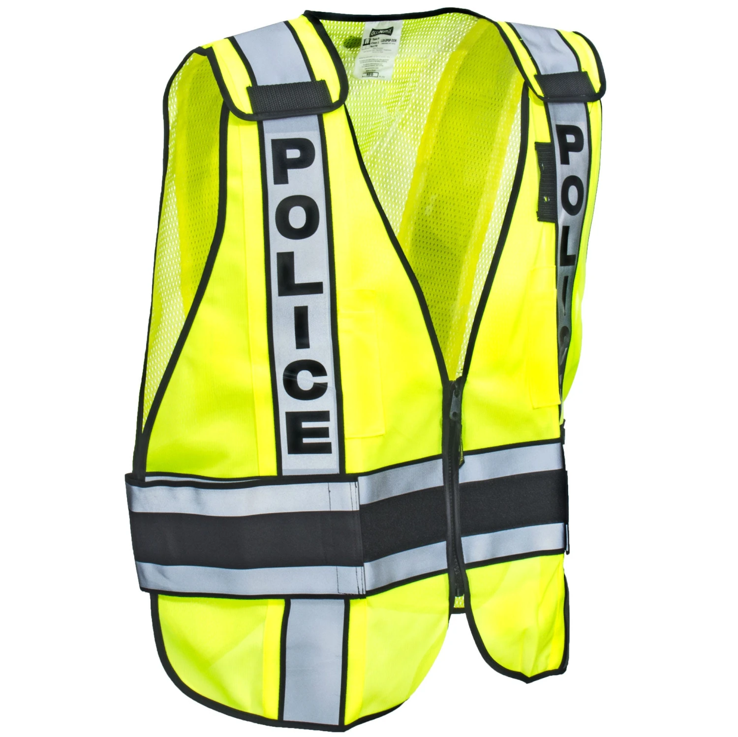 The high visibility yellow fabric is accented with 2-inch silver reflective tape on the waistline, shoulders, and back; the vertical tape on the chest also states “Police” in bold, block letters. This police safety vest is treated with specialty DOR to make the military grade fabric resistant to water, oil, dirt, and stains. Hey, this is a light-colored fabric, and stains are easy to see – no one wants to replace a perfectly good high visibility vest because of excessive staining. Thanks to the Durable Omni repellent (DOR) technology, you won’t have to. You can trust that even the worst of stains will easily wash out, keeping your men’s work vest looking like great the entire time you need it. This ANSI 107/2015 Type P Class 2 rated police vest is safe and reliable in low light situations, day or night. The fabric is extremely breathable to ensure that adding the Occunomix vest doesn’t add a layer of heat to your day. The five-point breakaway design and quick release zipper ensure it’s easy to get in and out of at the end of the day or in an emergency. Zipper loop closure secures the hi viz safety vest while you wear it, so you can concentrate on the job at hand.