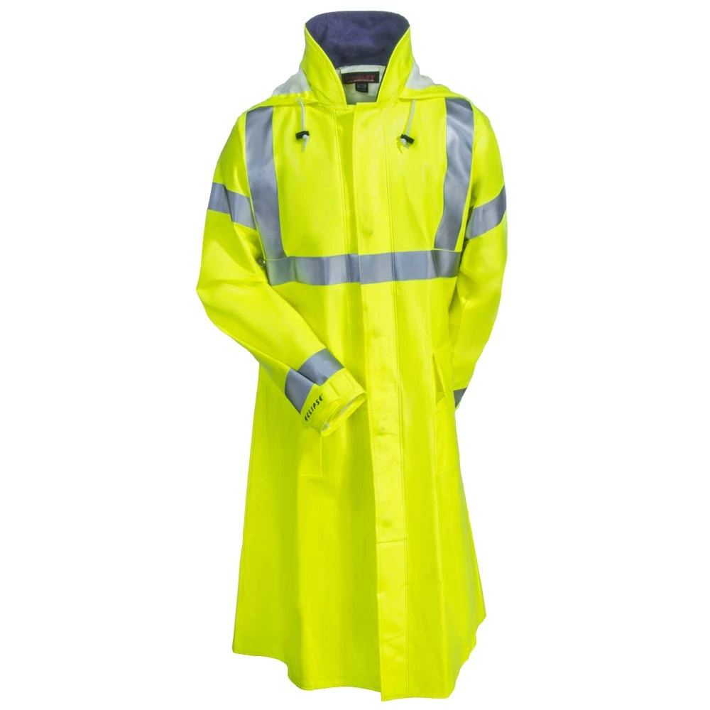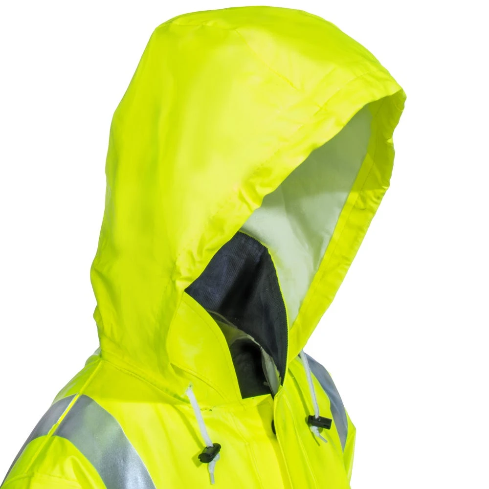 When you have a job that requires you to move around and do physically demanding work, you want to be comfortable. This soft, lightweight hi vis coat is designed to give off superior comfort and a customized fit. The Eclipse coat has overhead shoulders that are designed to give you breathability and allow for easy movement while you’re working overhead. The hook-and-loop take up straps on the wrists allow for a customized fit that feels best to you. There’s an oversized, 3-piece hood with adjustable hook-and-loop take-up straps that give off a safe fit. The fully vented cape back ensured all-day air circulation and comfort. The flame-resistant, corduroy collar gives additional comfort. You don’t have to be afraid of extreme weather because you’ll be cozy and protected while wearing this yellow coat.