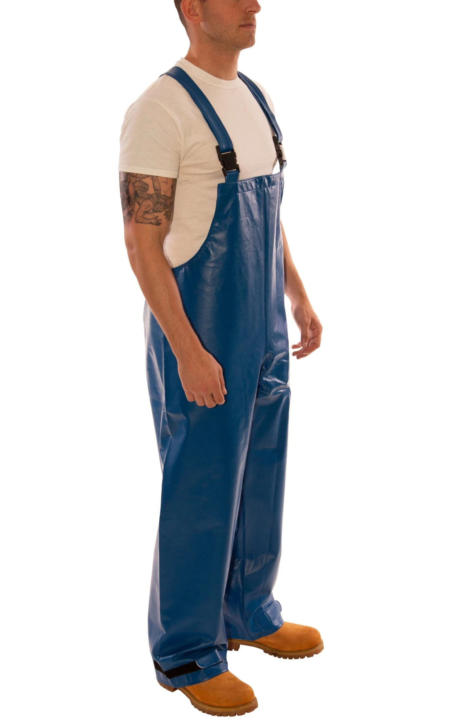 These blue FR work overalls are great for petrochemical, chemical, off-shore drilling, and any application where flash fire protection is mandatory. Tingley designed these to be mildew-resistant, and there are self material suspenders with heavy-duty quick-release buckles and crossovers for ease of wear. Non-conductive and non-corrosive buckles are in place, and there are hook-and-loop straps on the ankle cuffs to allow you to adjust the fit if needed. The flame-resistant PVC workwear features a distinctive safety blue color for easy identification purposes.